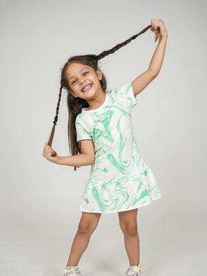 Let her stand out with our "Girls Multicolor Abstract Print Fit and Flared Dress". This stunning white dress features a beautiful pink abstract marble print all over, creating a unique and eye-catching design. The fit-and-flare silhouette offers a flattering and playful shape, perfect for twirling and dancing. Crafted from 100% soft and breathable cotton, this dress ensures she stays comfortable all day long.